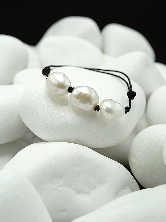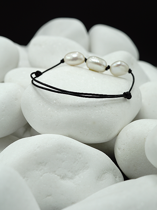 Rockowa bransoletka z białymi perłami z gatunku Barock na czarnym rzemieniu.